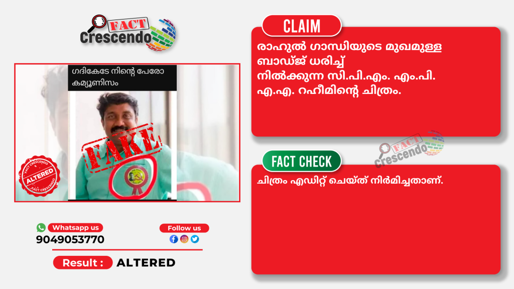 രാഹുല് ഗാന്ധിയുടെ മുഖമുള്ള ബാഡ്ജ് ധരിച്ച് നില്കുന്ന സി.പി.എം. എം.പി. എ.എ. റഹീമിന്റെ ചിത്രം എഡിറ്റ് ചെയ്ത് നിര്മിച്ചതാണെന്ന് അന്വേഷണത്തില് നിന്ന് വ്യക്തമാകുന്നു.