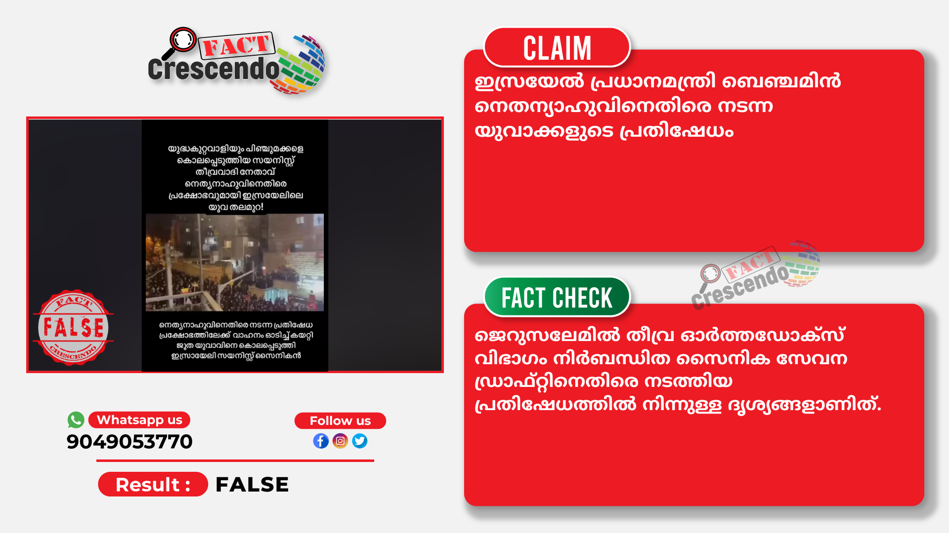 എന്നാല്‍ പ്രചരണം തെറ്റിധരിപ്പിക്കുന്നതാണെന്ന് അന്വേഷണത്തില്‍ ഞങ്ങള്‍ കണ്ടെത്തി. നിര്‍ബന്ധിത സൈനിക സേവന നിയമത്തിനെതിരെ ജൂതര്‍ ജറുസലേമില്‍ നടത്തിയ പ്രതിഷേധത്തില്‍ നിന്നുള്ള ദൃശ്യങ്ങളാണിത്.
