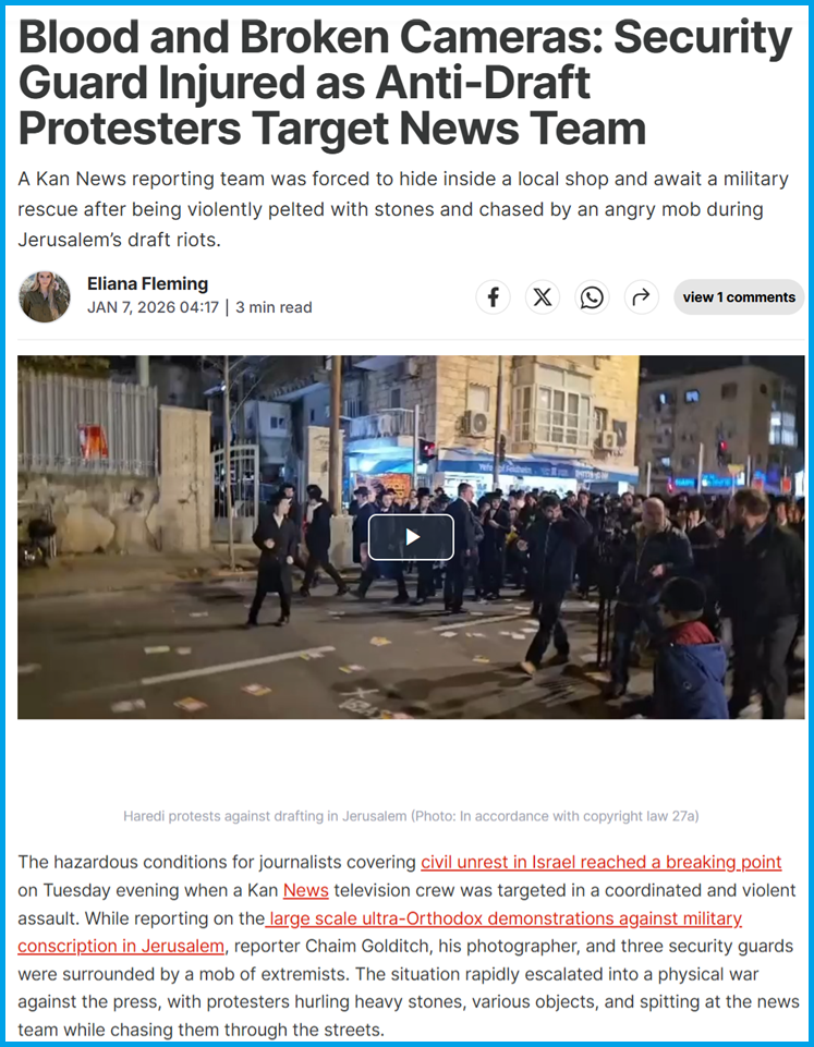 ഇതേ വീഡിയോ ഉള്‍പ്പെടുത്തി Jfeed.com  2026 ജനുവരി ഏഴിന് റിപ്പോര്‍ട്ട് പ്രസിദ്ധീകരിച്ചിട്ടുണ്ട്. നിര്‍ബന്ധിത സൈനിക സേവനത്തിനെതിരെ ജെറുസലേമില്‍ ഓര്‍ത്തഡോക്‌സ് വിഭാഗത്തിന്‍റെ പ്രകടനങ്ങള്‍ നടക്കുന്നതിനിടെ ജനുവരി ആറിന് പകര്‍ത്തിയ വീഡിയോയാണിതെന്ന് റിപ്പോര്‍ട്ടിലുണ്ട്. പ്രകടനം റിപ്പോര്‍ട്ട് ചെയ്യുന്നതിനിടെ പ്രതിഷേധക്കാര്‍ കാന്‍ ന്യൂസ് ടെലിവിഷന്‍ സംഘത്തെ ആക്രമിച്ചതായും റിപ്പോര്‍ട്ടില്‍ പറയുന്നു