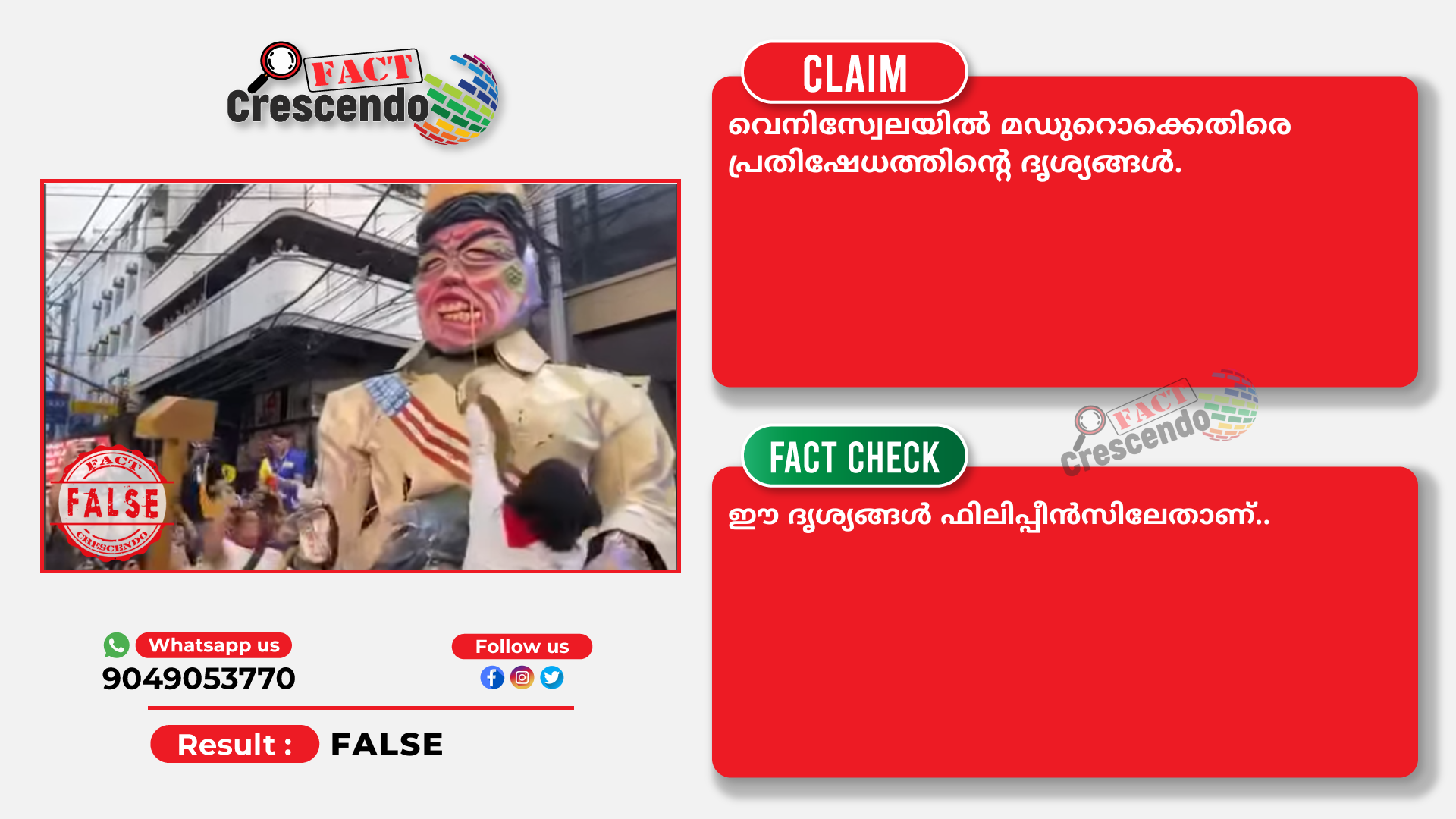 വെനിസ്വേലയിൽ മഡുറൊക്കെതിരെ പ്രതിഷേധത്തിൻ്റെ  ദൃശ്യങ്ങൾ എന്ന തരത്തിൽ പ്രചരിപ്പിക്കുന്ന വീഡിയോ ഫിലിപ്പീൻസിൽ അഴിമതിക്കെതിരെ നടന്ന പ്രതിഷേധത്തിൻ്റെ ദൃശ്യങ്ങളാണ്.