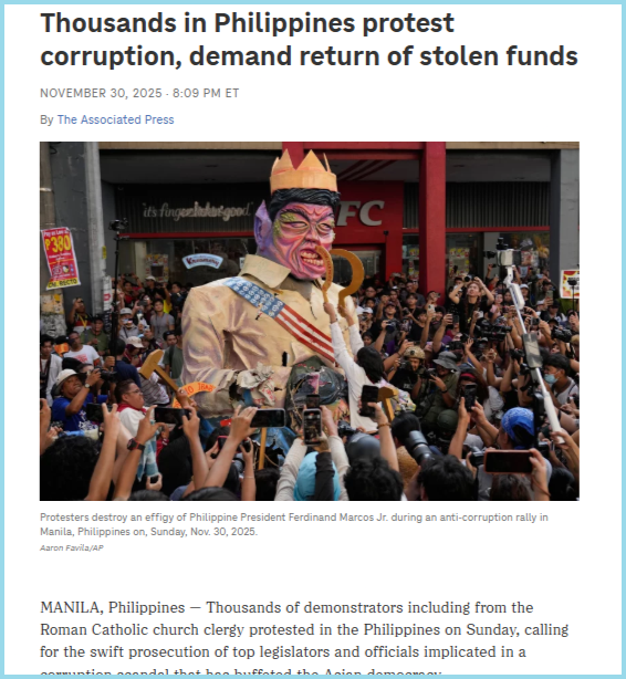 ഈ വാർത്ത പ്രകാരം കഴിഞ്ഞ കൊല്ലം നവംബറിൽ ഫിലിപ്പീൻസിൻ്റെ തലസ്ഥാന നഗരം മനിലയിൽ രാഷ്‌ട്രപതി ഫെർണാഡിനന്ദ് മാർകോ ജൂനിയറിനെതിരെ വൻ പ്രതിഷേധം നടന്നിരുന്നു. ഈ പ്രതിഷേധത്തിൽ റോമൻ കാത്തോലിക പുരോഹിതന്മാരും ഇടത്  പക്ഷ പാർട്ടികളും വ്യത്യസ്തമായി മാർക്കൊക്കെതിരെ പ്രതിഷേധം നടത്തി. ഇടത്  പക്ഷ കാരുടെ പ്രതിഷേധത്തിൻ്റെ ദൃശ്യങ്ങളാണ് നാം പ്രസ്തുത വീഡിയോയിൽ കാണുന്നത്. ഈ പ്രതിഷേധത്തിൻ്റെ വീഡിയോ നമുക്ക് താഴെ നൽകിയ അൽ ജസീറയുടെ വാർത്തയിലും കാണാം.