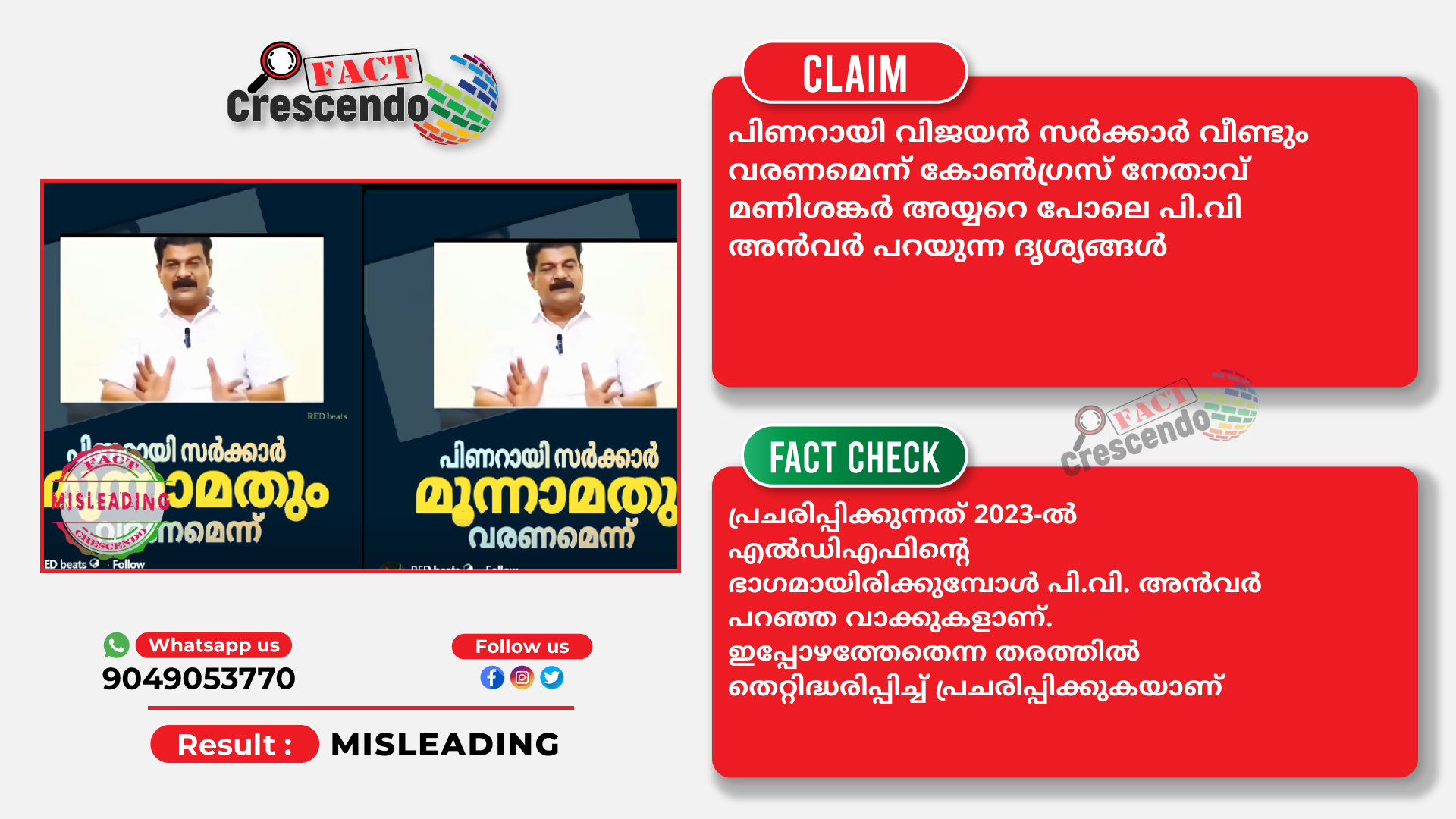 പിണറായി വിജയൻ സർക്കാർ വീണ്ടും വരണമെന്ന് കോൺഗ്രസ് നേതാവ് മണിശങ്കർ അയ്യറെ പോലെ പി.വി അൻവറും പറഞ്ഞുവെന്ന് പ്രചരിപ്പിക്കുന്നത് 2023-ൽ എൽഡിഎഫിന്റെ ഭാഗമായിരിക്കുമ്പോള് പി.വി. അൻവർ പറഞ്ഞ വാക്കുകളാണ്. ഇപ്പോഴത്തേതെന്ന തരത്തിൽ തെറ്റിദ്ധരിപ്പിച്ച് പ്രചരിപ്പിക്കുകയാണ്.