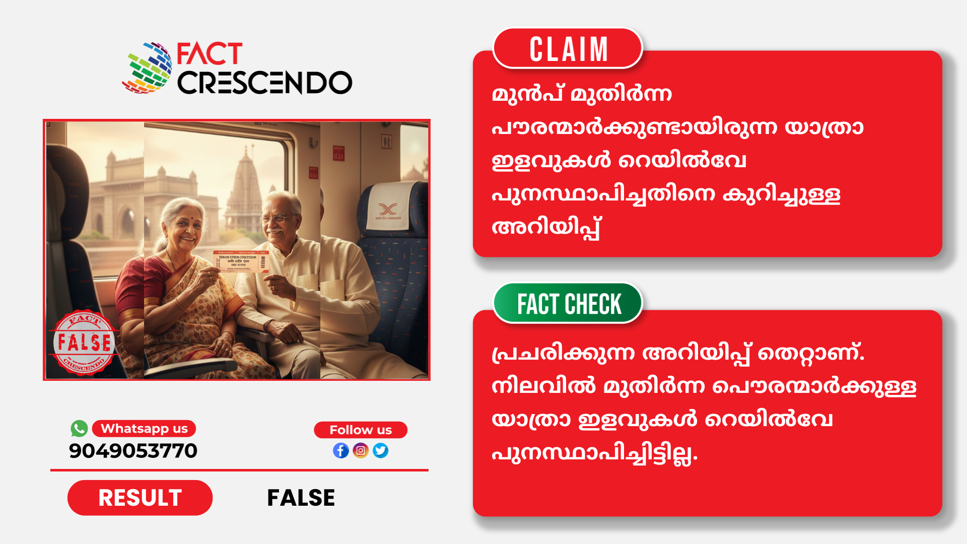 Title:മുതിര്ന്ന പൌരന്മാര്ക്കുള്ള യാത്രാ ഇളവുകള് റെയില്വേ പുനസ്ഥാപിച്ചു എന്ന അറിയിപ്പ് തെറ്റാണ്…