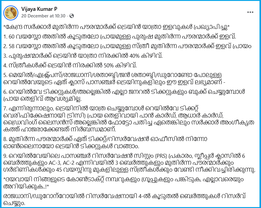 ഇന്ത്യൻ റെയിൽവേ മുമ്പ് മുതിർന്ന പൗരന്മാർക്ക് നല്കി വന്നിരുന്ന യാത്രാ ഇളവുകൾ ഇടയ്ക്ക് പിന്വലിച്ചിരുന്നു. ഇളവുകള് പുനസ്ഥാപിച്ചുവെന്ന അവകാശവാദത്തോടെ ചില കുറിപ്പുകള് സാമൂഹ്യ മാധ്യമങ്ങളിൽ പ്രചരിക്കുന്നുണ്ട്.
