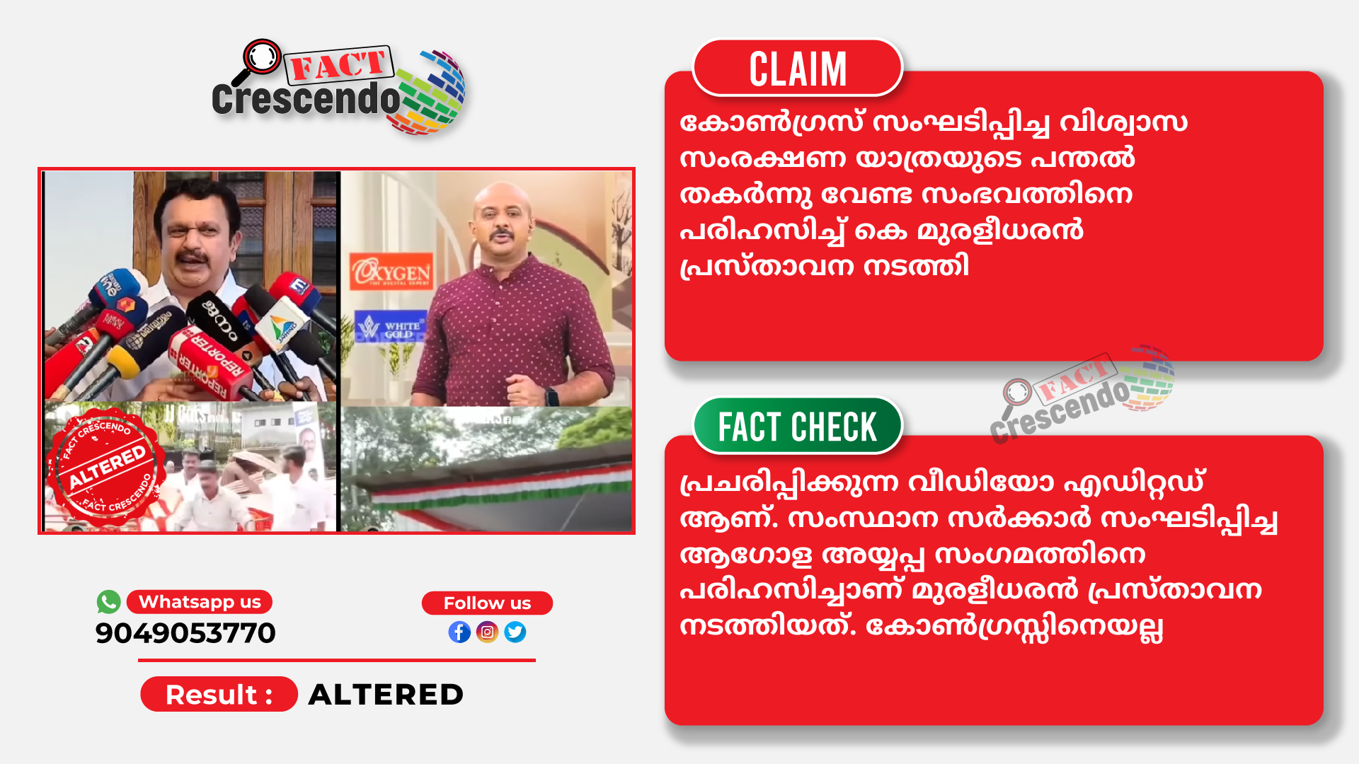 കോണ്ഗ്രസ് സംഘടിപ്പിച്ച വിശ്വാസ സംരക്ഷണ യാത്രയുടെ പന്തല് തകര്ന്നു വേണ്ട സംഭവത്തിനെ പരിഹസിച്ച് കെ മുരളീധരന് പ്രസ്താവന നടത്തിയെന്ന് പ്രചരിപ്പിക്കുന്ന വീഡിയോ എഡിറ്റഡ് ആണ്. സംസ്ഥാന സര്ക്കാര് സംഘടിപ്പിച്ച ആഗോള അയ്യപ്പ സംഗമത്തിനെ പരിഹസിച്ചാണ് മുരളീധരന് പ്രസ്താവന നടത്തിയത്. കോണ്ഗ്രസ്സിനെയല്ല.