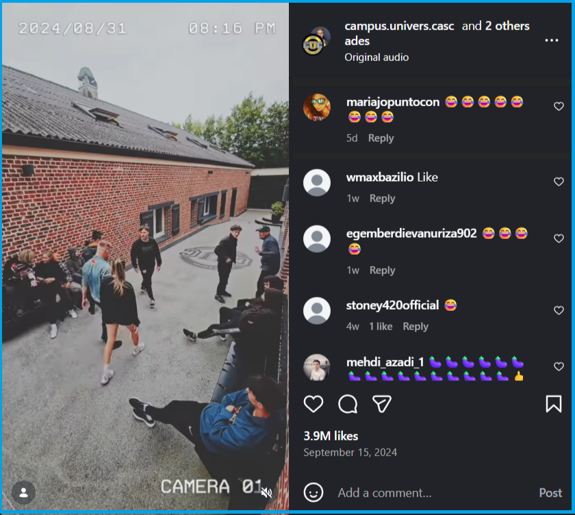 ദൃശ്യങ്ങളിലെ സംഘട്ടനം കണ്ടാല് കായികമുറകള് അഭ്യസിച്ചവരാണ് ഇതെന്ന് അനായാസം മനസ്സിലാകും. അതുകൂടാതെ തെരുവില് പെട്ടെന്ന് സംഘട്ടനം ഉണ്ടാകുമ്പോള് ഇരുകൂട്ടരും തമ്മില് അടിക്കുകയോ ഇടിക്കുകയോ ചെയ്യുന്ന രീതിയിലല്ല ഇവര് സംഘട്ടനം നടത്തുന്നത്. ഞങ്ങള് വീഡിയോ കീഫ്രെയിമുകളുടെ റിവേഴ്സ് ഇമേജ് അന്വേഷണം നടത്തിയപ്പോൾ ഇതേ ദൃശ്യങ്ങള് കാമ്പസ് യൂണിവേഴ്സ് കാസ്ക് ഇൻസ്റ്റഗ്രാം പേജിൽ 2024 സെപ്റ്റംബർ 15ന് നല്കിയതായി കണ്ടു.
