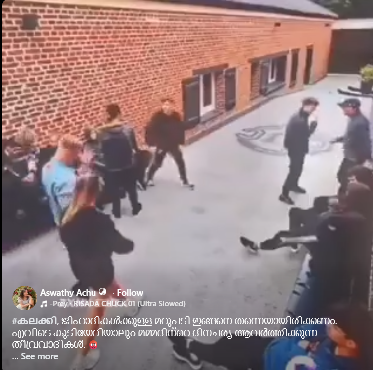 ഏതോ വിദേശ രാജ്യത്ത് ഒരു സ്ത്രീയും പുരുഷനും നടന്ന് പോകുന്നതും വഴിയില് ഒരാള് മുന്നോട്ടു വന്നു അവളുടെ മുഖത്ത് സ്പര്ശിക്കുന്നതും അവളുടെ കൂടെയുണ്ടായിരുന്നയാള് ശക്തമായി തിരിച്ചടിക്കുന്നതും കാണാം. സ്ത്രീയും അതിശക്തമായി തിരിച്ച് അവരെ ‘കൈകാര്യം’ ചെയ്യുന്നുണ്ട്. കുടിയേറിയ മുസ്ലിം ജിഹാദികളാണ് ഇക്കൂട്ടരെന്ന് സൂചിപ്പിച്ച് ഒപ്പമുള്ള വിവരണം ഇങ്ങനെ: