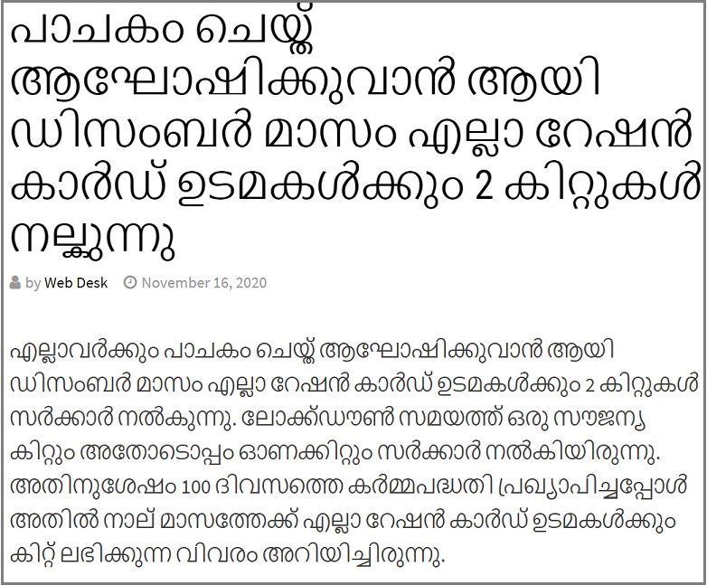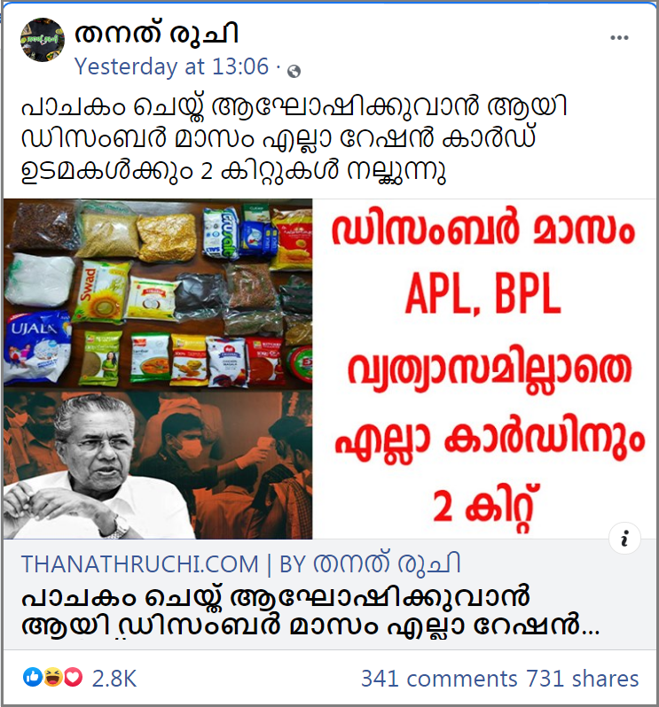 വാര്ത്ത ഇങ്ങനെയാണ്: “പാചകം ചെയ്ത് ആഘോഷിക്കുവാൻ ആയി ഡിസംബർ മാസം എല്ലാ റേഷൻ കാർഡ് ഉടമകൾക്കും 2 കിറ്റുകൾ നല്കുന്നു” വാര്ത്തയുടെ ഒപ്പം നല്കിയിരിക്കുന്ന ചിത്രത്തില് “ഡിസംബര് മാസം എപിഎല് – ബിപിഎല് വ്യത്യാസമില്ലാതെ എല്ലാ കാര്ഡിനും രണ്ടു കിറ്റ് “ എന്നും പ്രത്യേകം നല്കിയിട്ടുണ്ട്.