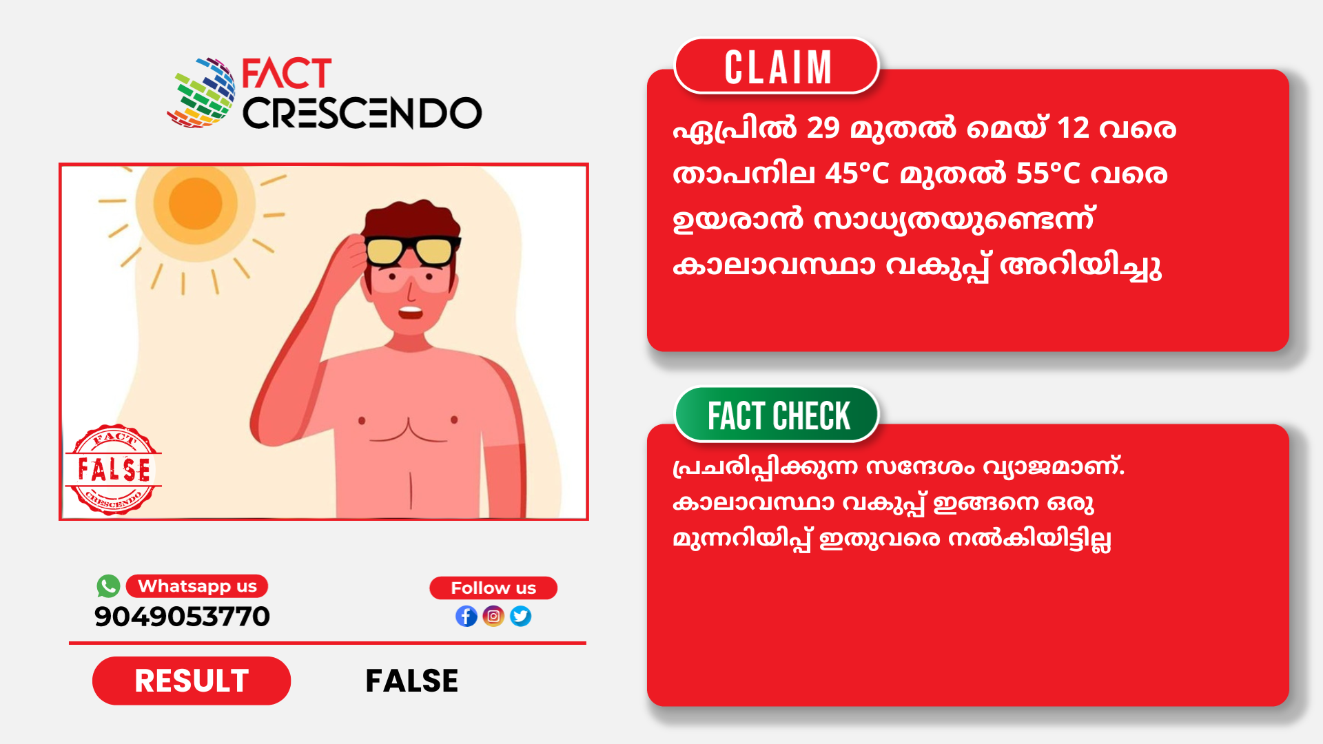 ഏപ്രിൽ 29 മുതൽ മെയ് 12 വരെ താപനില 45°C മുതൽ 55°C വരെ ഉയരാൻ സാധ്യതയുണ്ടെന്ന് കാലാവസ്ഥാ വകുപ്പ് അറിയിച്ചു എന്ന് പ്രചരിപ്പിക്കുന്ന സന്ദേശം വ്യാജമാണ്. കാലാവസ്ഥാ വകുപ്പ് ഇങ്ങനെ ഒരു മുന്നറിയിപ്പ് ഇതുവരെ നല്കിയിട്ടില്ല.