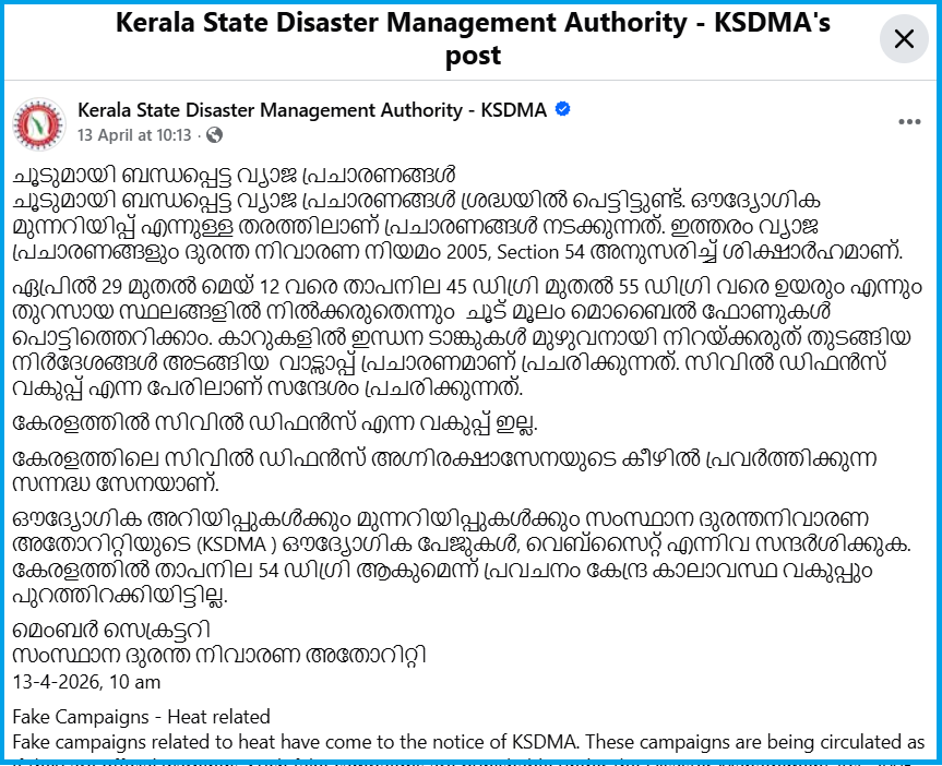 കേരളത്തിലെയും ലക്ഷദ്വീപിലെയും കാലാവസ്ഥാ നിരീക്ഷണവും പ്രവചനവും നടത്തുന്ന തിരുവനന്തപുരത്തെ നിരീക്ഷണ കേന്ദ്രത്തിന്റെ സോഷ്യല് മീഡിയ പേജുകളിലും ഞങ്ങള് തിരഞ്ഞു. എന്നാല് ഇങ്ങനെ അറിയിപ്പ് നല്കിയിട്ടില്ല. കേന്ദ്രം പുറത്തിറക്കുന്ന പത്രകുറിപ്പിലും പ്രചരിക്കുന്ന സന്ദേശത്തിൽ പറയുന്നതുപോലെ താപനിലയിൽ അതിയായ വർധന ഉണ്ടാകുമെന്ന് പറയുന്നില്ല . സംസ്ഥാനത്ത് ചൂട് കൂടുന്ന സാഹചര്യത്തിൽ പൊതുജനങ്ങൾക്കായി സംസ്ഥാന ദുരന്ത നിവാരണ അതോറിറ്റി ജാഗ്രത നിർദേശങ്ങൾ നൽകിയിരുന്നു.