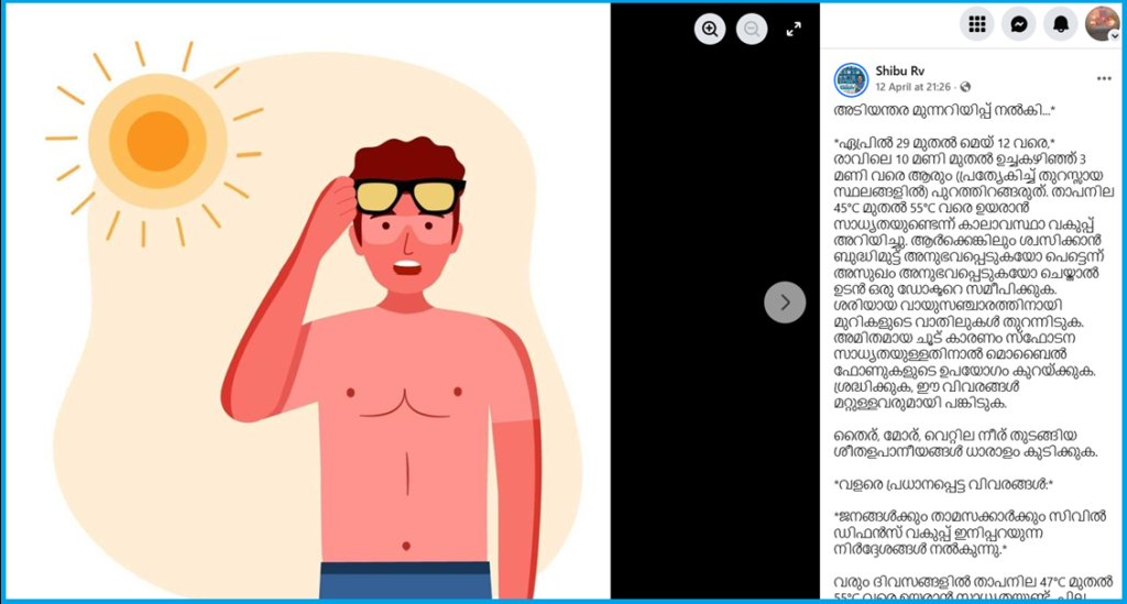 “ഏപ്രിൽ 29 – മെയ് 12 വരെ, താപനില 45°C മുതൽ 55°C വരെ ഉയരാൻ സാധ്യതയുണ്ടെന്ന് കാലാവസ്ഥാ വകുപ്പ് അറിയിച്ചു എന്നാണ് സന്ദേശത്തില് പറയുന്നത്. സന്ദേശത്തിന്റെക്കുന്നതാ മുന്നറിയിപ്പ് നല്കിയിട്ടില്ലെന്നും സന്ദേശം തെറ്റിദ്ധരിപ്പി പൂര്ണ്ണ രൂപം ഇങ്ങനെ: “അടിയന്തര മുന്നറിയിപ്പ് നൽകി…*