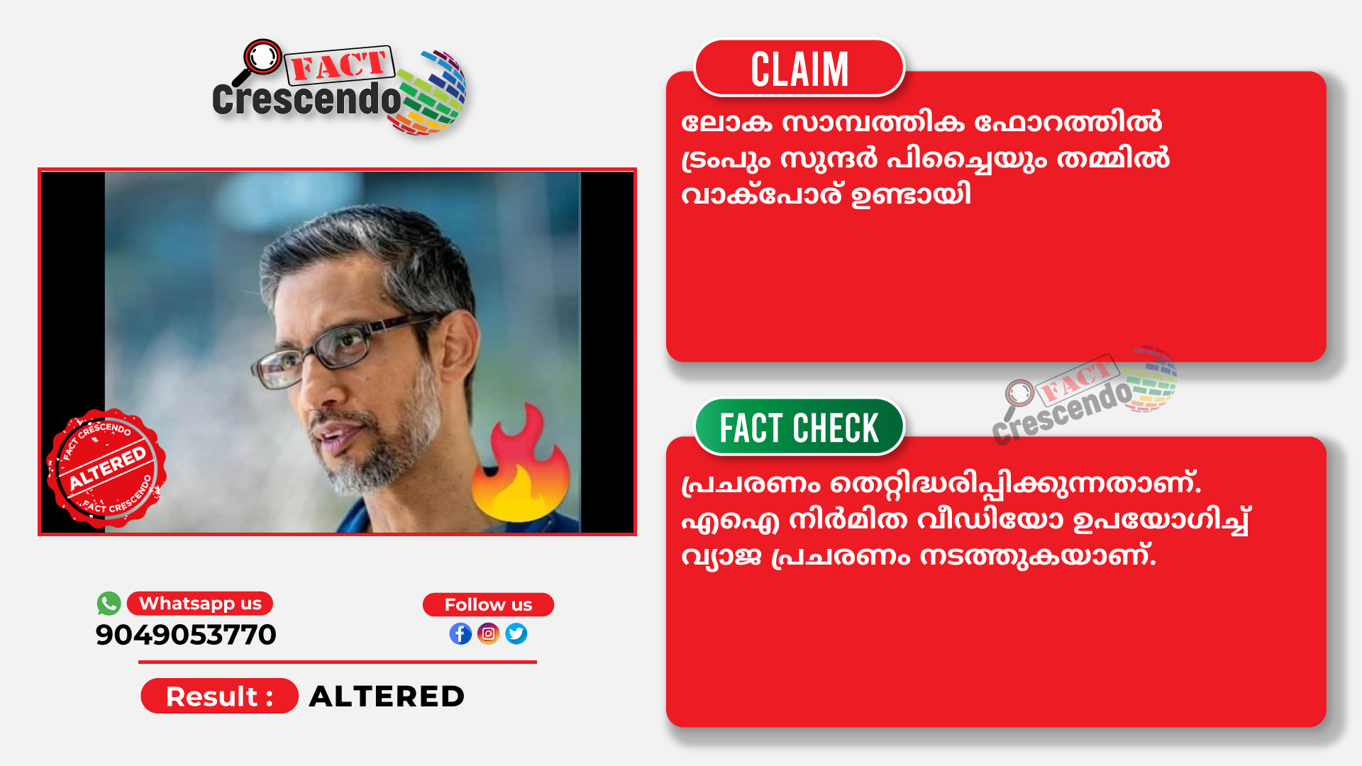 ലോക സാമ്പത്തിക ഫോറത്തിൽ ട്രംപും സുന്ദർ പിച്ചൈയും തമ്മില് വാക്പോര് ഉണ്ടായി എന്ന തരത്തിലുള്ള പ്രചരണം തെറ്റിദ്ധരിപ്പിക്കുന്നതാണ്. എഐ നിര്മിത വീഡിയോ ഉപയോഗിച്ച് വ്യാജ പ്രചരണം നടത്തുകയാണ്.