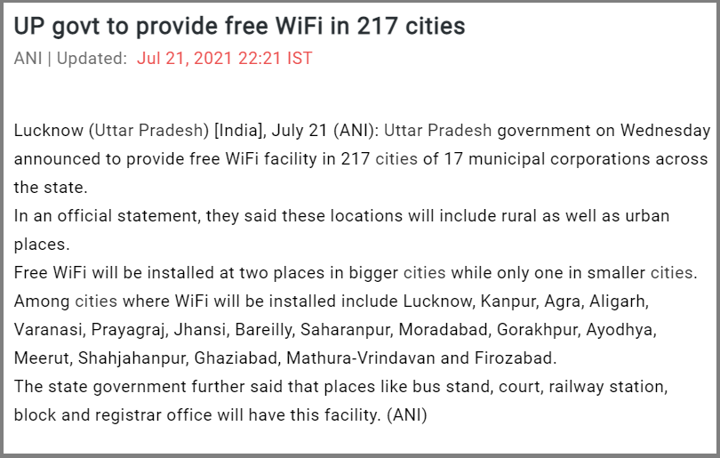 ദേശീയ മാധ്യമങ്ങൾ അടക്കം എല്ലാവരും ഇതുസംബന്ധിച്ച വാർത്ത നൽകിയിട്ടുണ്ട്.  ഉത്തർപ്രദേശ് ഗവൺമെന്‍റ് 217 പട്ടണങ്ങളിലും 17 മുൻസിപ്പൽ കോർപ്പറേഷൻ സൗജന്യ വൈഫൈ നൽകുമെന്നാണ് പറഞ്ഞിട്ടുള്ളത്. സംസ്ഥാനത്തെ എല്ലാവർക്കും സമ്പൂർണമായി സൗജന്യമായി നൽകുമെന്ന് സര്‍ക്കാര്‍ പ്രഖ്യാപനത്തിൽ ഇല്ല.