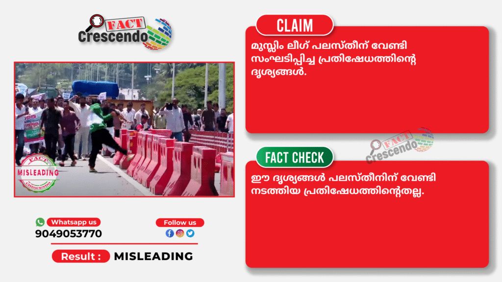 മുസ്ലിം ലീഗ് പലസ്തീനിന് വേണ്ടി സംഘടിപ്പിച്ച പ്രതിഷേധത്തിൻ്റെ ദൃശ്യങ്ങൾ എന്ന തരത്തിൽ ഒരു വീഡിയോ സമൂഹ മാധ്യമങ്ങളിൽ പ്രചരിപ്പിക്കുന്നുണ്ട്.