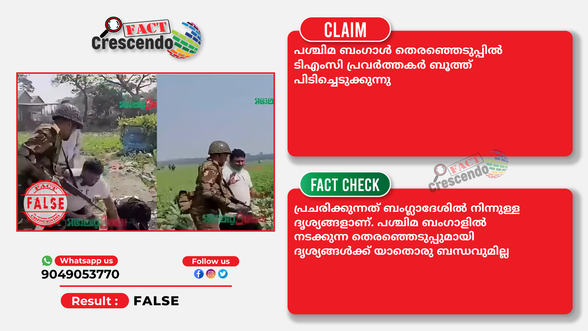 തൃണമുൽ കോൺഗ്രസ് പ്രവർത്തകർ ബൂത്ത് പിടിച്ചെടുക്കുന്ന ദൃശ്യം എന്ന രീതിയിൽ ഒരു വീഡിയോ സമൂഹമാധ്യമങ്ങളിൽ പ്രചരിക്കുന്നുണ്ട്.