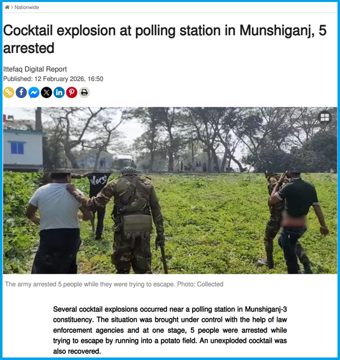 മുൻഷിഗഞ്ച്-3 മണ്ഡലത്തിലെ ഒരു പോളിംഗ് സ്റ്റേഷന് സമീപം നിരവധി കോക്ടെയ്ല് സ്ഫോടനങ്ങൾ ഉണ്ടായതായി സൈന്യം സ്ഥിതിഗതികൾ നിയന്ത്രണവിധേയമാക്കിയെന്നും മാധ്യമ റിപ്പോർട്ട് ഉണ്ട്. ഉരുളക്കിഴങ്ങ് പാടത്തേക്ക് ഓടി രക്ഷപ്പെടാൻ ശ്രമിക്കുന്നതിനിടെ 5 പേരെ അറസ്റ്റ് ചെയ്തുവെന്നും ഇവരിൽ നിന്നും ഒരു കോക്ടെയ്ല് കണ്ടെടുത്തുവെന്നും റിപ്പോർട്ടിൽ വ്യക്തമാക്കുന്നു. റഹ്മത്ത് മാജി, പർവേസ് മാജി, എംഡി കമാൽ, അർഷാദ് മാജി, സലിം മാജി എന്നിവരെയാണ് സൈന്യം അറസ്റ്റ് ചെയ്തത്. അതായത് ദൃശ്യങ്ങള് ബംഗ്ലാദേശില് നിന്നുള്ളതാണ്, പശ്ചിമ ബംഗാളിലെതല്ല.