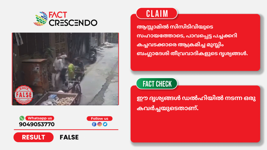 ആസ്സാമിൽ സിസിടിവിയുടെ സഹായത്തോടെ, പാവപ്പെട്ട പച്ചക്കറി കച്ചവടക്കാരെ ആക്രമിച്ച മുസ്ലിം ബംഗ്ലാദേശി തീവ്രവാദികളുടെ ദൃശ്യങ്ങൾ എന്ന തരത്തിൽ പ്രചരിപ്പിക്കുന്നത് കഴിഞ്ഞ കൊല്ലം ഡൽഹിയിൽ നടന്ന ഒരു കവർച്ചയുടെ ദൃശ്യങ്ങളാണ്.