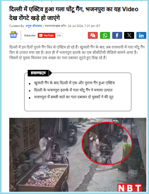 വാർത്ത പ്രകാരം ഈ ദൃശ്യങ്ങൾ ഡൽഹിയിലെ ഭജൻപുര ഭാഗത്തിലേതാണ്. ഇവിടെ സജീവമായി പ്രവർത്തിക്കുന്ന കുറ്റവാളികളുടെ സമൂഹം ഗല ഘോട്ടു ഗാങ് ഒരു പച്ചക്കറി കച്ചവടക്കാരനെ ആക്രമിച്ച് കൊള്ളയാടിയ സംഭവത്തിൻ്റെ ദൃശ്യങ്ങളാണ്. ഈ സംഭവം ഒരു കൊല്ലം പഴയതാണ്. ആജ് തക് പ്രസിദ്ധികരിച്ച വാർത്ത പ്രകാരം ഈ സംഭവം 21 ജൂലൈ 2024ന് ഡൽഹിയിലെ ഭജൻപുരയിൽ നടന്നതാണ്. മൂന്ന് പേര് ഒരു പച്ചക്കറി കച്ചവടക്കാരനെ ആക്രമിച്ച് അയാളുടെ പണം കൊള്ളയടിച്ച് ഓടി. ഇവർ ഡൽഹിയിലെ ഗല ഘോട്ടു ഗാങ് അതായത് ഇരകളുടെ കഴുത്ത് ഞെക്കി അവരെ കൊള്ളയടിക്കുന്ന സംഘത്തിൻ്റെ അംഗങ്ങളാണ്.