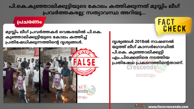 പോസ്റ്റില് വാദിക്കുന്നത് പൂര്ണമായി തെറ്റാണ്. മുസ്ലിം ലീഗ് പ്രവര്ത്തകര് വെങ്കരയില് പി.കെ. കുഞ്ഞാലിക്കുട്ടിയുടെ കോലം കത്തിച്ച് പ്രതിഷേധിച്ചു എന്ന് വാദിച്ച് പ്രചരിപ്പിക്കുന്ന വീഡിയോ 2018ല് കാസര്ഗോഡില് നാഷണല് യൂത്ത് ലീഗ് മുത്തലാഖ് ബില്ലിന്റെ വോട്ടെടുപ്പില് പങ്കെടുക്കാത്തതിനാല് ഇങ്ങനെ പി.കെ. കുഞ്ഞാലിക്കുട്ടി എം.പിക്കെതിരെ പ്രതിഷേധം ചെയ്തത്.