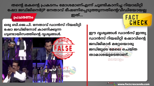 Title:FACT CHECK: തന്റെ മകന്റെ പ്രകടനം മോശമാണ് എന്ന് ചൂണ്ടികാനിച്ച റിയാലിറ്റി ഷോ ജഡ്ജിനെ BJP നേതാവ് ഭീഷണിപ്പെടുത്തുന്നതിന്റെ വീഡിയോയല്ല ഇത്…