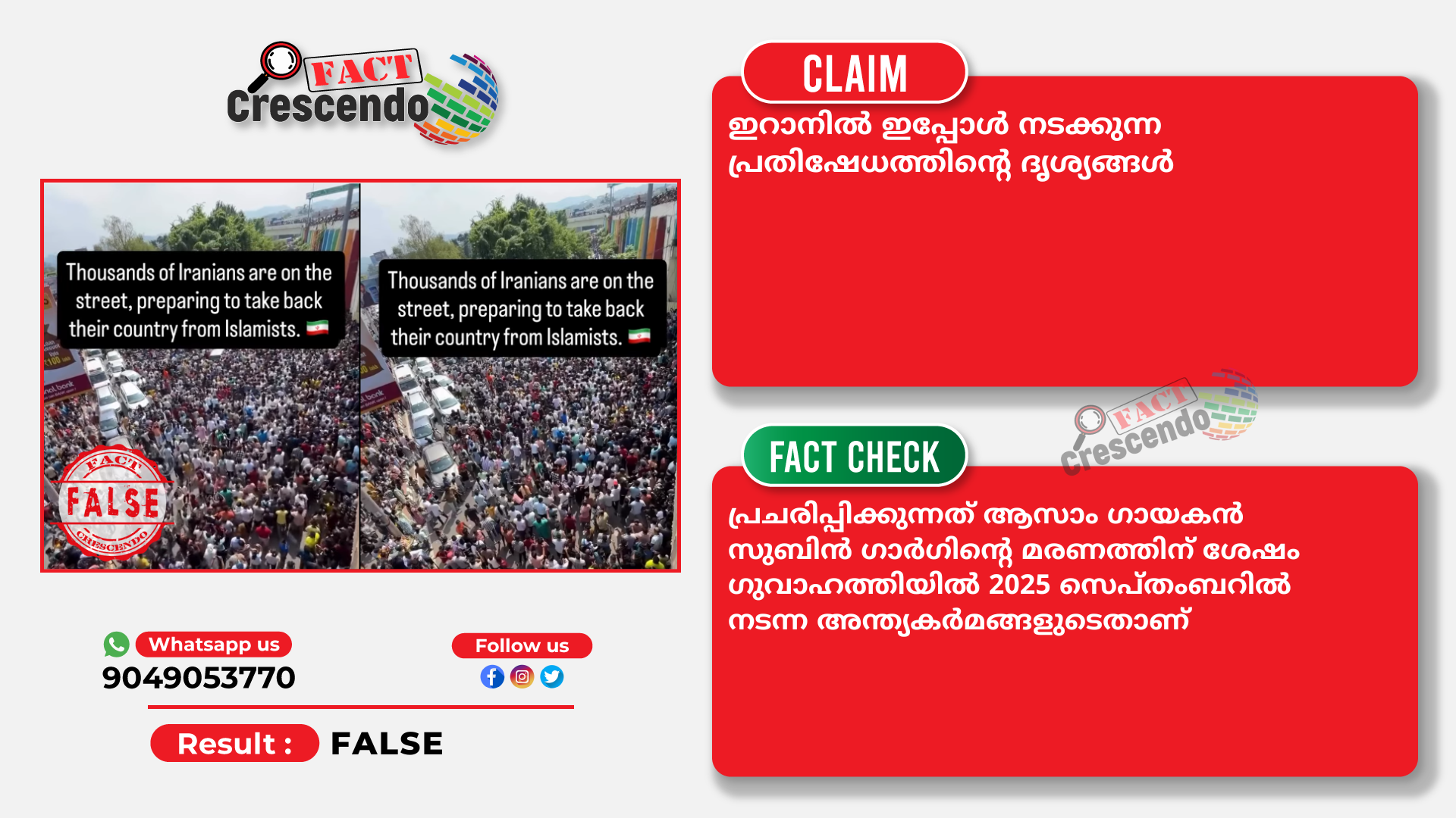 ഇറാനില് ഇപ്പോള് നടക്കുന്ന പ്രതിഷേധത്തിന്റെ ദൃശ്യങ്ങള് എന്ന് പ്രചരിപ്പിക്കുന്നത് ആസാം ഗായകൻ സുബിൻ ഗാർഗിന്റെ മരണത്തിന് ശേഷം ഗുവാഹത്തിയില് 2025 സെപ്തംബറില് നടന്ന അന്ത്യകർമങ്ങളുടെതാണ്. ഇറാനുമായി ദൃശ്യങ്ങള്ക്ക് യാതൊരു ബന്ധവുമില്ല.