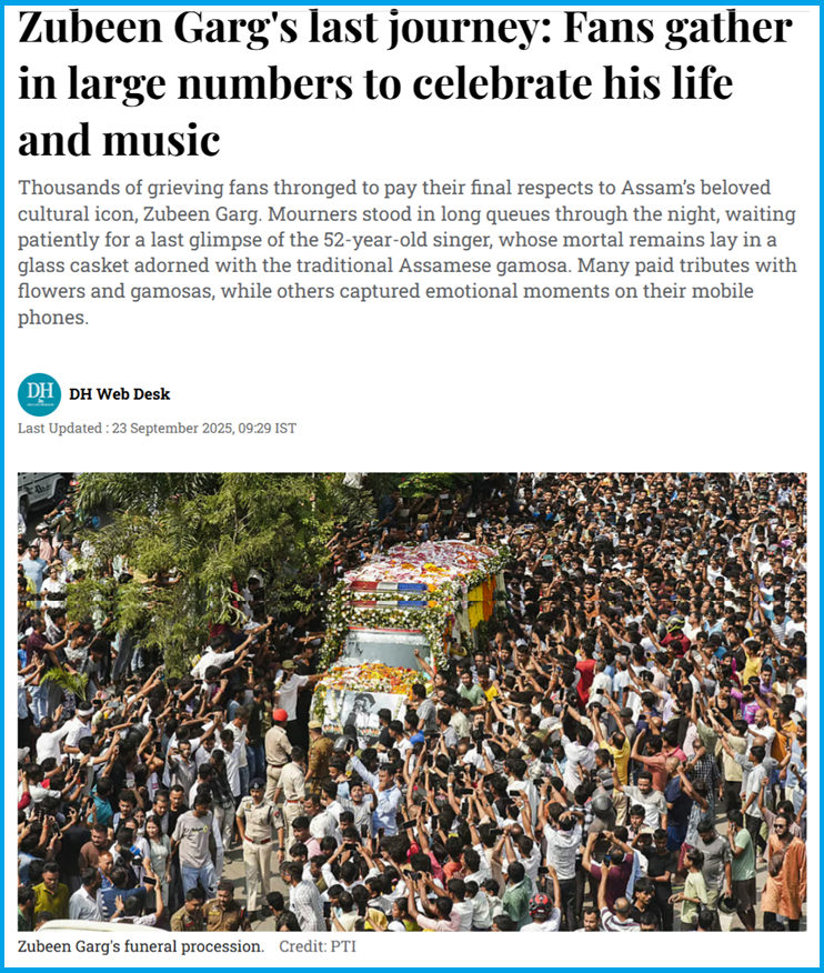 “ആയിരക്കണക്കിന് ആരാധകർ അന്ത്യാഞ്ജലി അർപ്പിക്കാൻ തടിച്ചുകൂടി. പരമ്പരാഗത ആസാമീസ് ഗമോസ കൊണ്ട് അലങ്കരിച്ച ഗ്ലാസ് ശവമഞ്ചത്തിൽ പ്രദര്ശിപ്പിച്ച ഗായകനെ അവസാനമായി ഒരു നോക്ക് കാണാൻ ആരാധകർ രാത്രി മുഴുവൻ നീണ്ട ക്യൂവിൽ കാത്തിരുന്നു. പലരും പൂക്കളും ഗമോസകളും നൽകി ആദരാഞ്ജലി അർപ്പിച്ചു, മറ്റുള്ളവർ വൈകാരിക നിമിഷങ്ങൾ മൊബൈൽ ഫോണുകളിൽ പകർത്തിയെന്നും റിപ്പോർട്ട് പറയുന്നു.