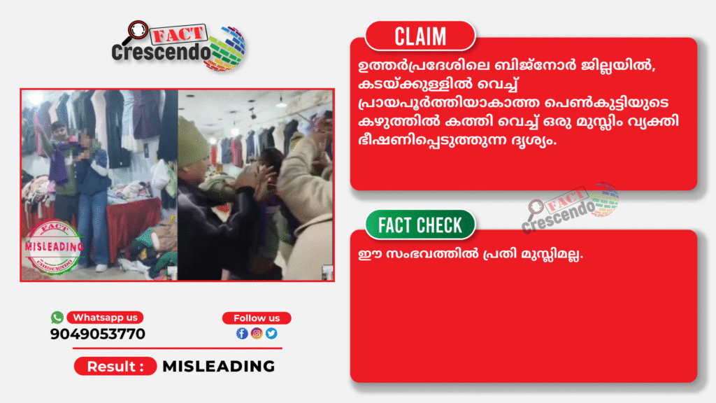 ഉത്തർപ്രദേശിലെ ബിജ്നോർ ജില്ലയിൽ, കടയ്ക്കുള്ളിൽ വെച്ച് പ്രായപൂർത്തിയാകാത്ത പെൺകുട്ടിയുടെ കഴുത്തിൽ കത്തി വെച്ച് ഒരു മുസ്ലിം വ്യക്തി ഭീഷണിപ്പെടുത്തുന്ന ദൃശ്യം എന്ന തരത്തിൽ ഒരു വീഡിയോ സമൂഹ മാധ്യമങ്ങളിൽ പ്രചരിപ്പിക്കുന്നുണ്ട്.