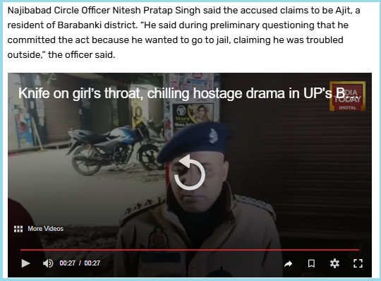 ഈ വാർത്ത പ്രകാരവും പ്രതിയുടെ പേര് അജിത് എന്നാണ്. നജീബാബാദ് സർക്കിൾ ഓഫീസർ നിതേഷ് പ്രതാപ് സിംഗ് പ്രകാരം പ്രാഥമിക ചോദ്യമെടുപ്പിൽ ഇയാൾ പറഞ്ഞത് ജയിലിൽ പോകാനാണ് ഇയാൾ ഈ കുറ്റം ചെയ്തത്. ഭാസ്കർ ഇംഗ്ലീഷ് പ്രസിദ്ധികരിച്ച വാർത്ത പ്രകാരവും ഈ സംഭവത്തിലെ പ്രതിയുടെ പേര് അജിത് ആണ്. ഇയാൾ ബാരാബങ്കിയിലെ സുർജെൻപുർ ഗ്രാമത്തിലെ നിവാസിയാണ്.