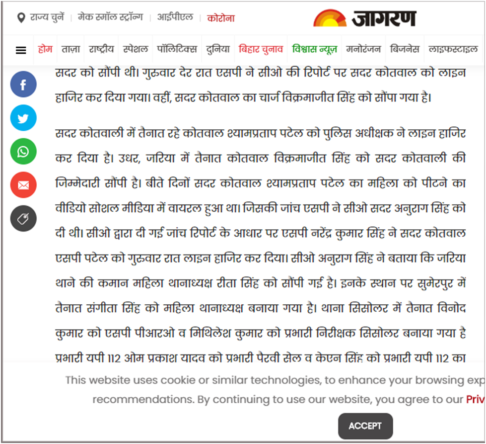 ഈ വിവരം ഉപയോഗിച്ച് ഞങ്ങള് അന്വേഷിച്ചപ്പോള് ഒക്ടോബര് 1, 2020ന് ദൈനിക് ജാഗ്രന് പ്രസിദ്ധികരിച്ച വാര്ത്ത ലഭിച്ചു. വാര്ത്ത പ്രകാരം ആരോപിതനായ എസ്.ഓ. ശ്യാം പ്രതാപ് പറ്റെലിനെ സസ്പണ്ട് ചെയ്തിട്ടുണ്ട്. അദേഹത്തിന്റെ സ്ഥാനത്ത് വിക്രംജീത് സിംഗ് എന്ന പോലീസ് ഉദ്യോഗസ്ഥനെയാണ് പുതിയ എസ്.ഓ. ആയി നിയമിച്ചത്.