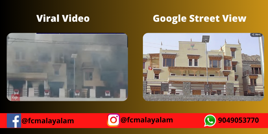 ലഡാക്കിൽ നടന്ന പ്രതിഷേധത്തിൽ കത്തിച്ച ലേയിലെ BJP ആസ്ഥാനത്തിൻ്റെ ദൃശ്യങ്ങളാണിത് എന്ന് ഈ വാർത്ത വ്യകതമാകുന്നു. താഴെ നമുക്ക് ലേയിലെ BJP ആസ്ഥാനത്തിൻ്റെ ഗൂഗിൾ സ്ട്രീറ്റ് വ്യൂ കാണാം.